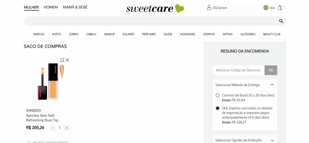 Na Sweetcare e na maiorias dos outros sites, você encontra os impostos quando coloca seu produto o carrinho. Ao clicar para ver o carrinho você vai clicar em “selecionar método de envio” e escolher a opção: DHL. Onde todos os direitos de importação e impostos já são pagos antecipadamente. Como mostro na imagem abaixo: