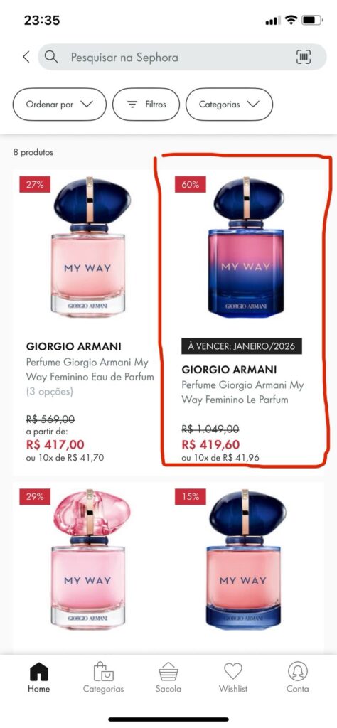 Se tiver uma Sephora próxima de você, vá a loja. As promoções em loja pelo que observamos em alguns produtos estava mais vantajosa na loja física. Como foi por exemplo com o My Way Le Parfum, no app ele de 50ml está (até o momento do desenvolvimento desse post) saindo de R$ 1.049,00 por R$419,60. O que já é um baita descontão, porém na loja o mesmo perfume, na mesma volumetria estava saindo por R$314,70. Ou seja mais de R$100,00 de diferença do app para a loja física. Segue print do app e foto tirada na loja.