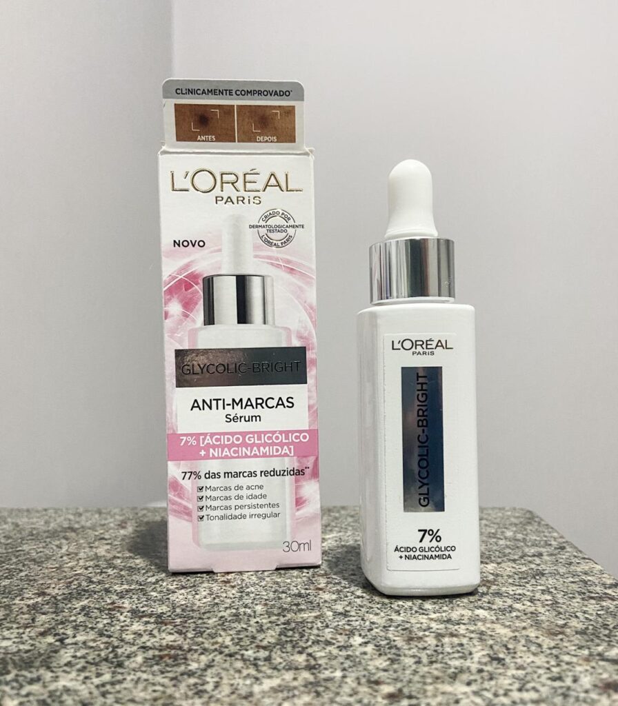 – Tratamento: Assim como pela manhã o primeiro passo após a limpeza é um sérum. E nesse momento tenho usado o Glycolic Bright Sérum Anti-Marcas de L’oréal Paris. Assim como os outros produtos tem a resenha dele completa aqui no blog, CLICA AQUI para conferir. O sérum promete ter 5x ações corretivas, afim de proporcionar uma pele com menos marcas de acne, marcas da idade, tonalidade irregular e marcas persistentes.